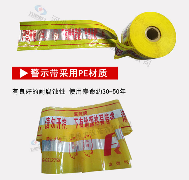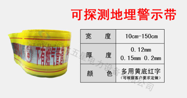 地埋式可探測警示帶:寬度:10cm-150cm 厚度:0.12mm、0.15mm、 顏色:多用黃底紅字。中間夾層中有一層鋁箔,寬度約為5-cm